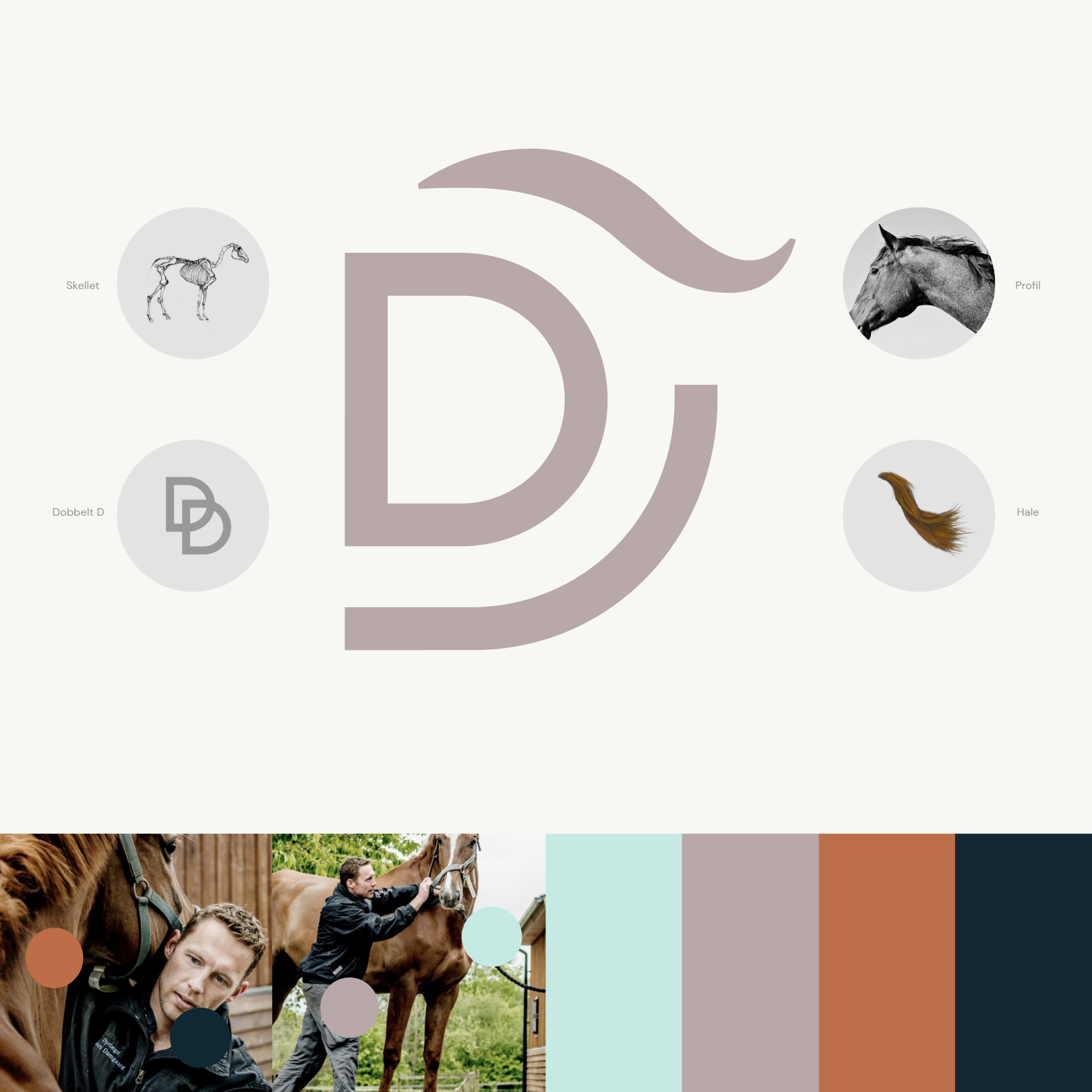 Logoet til Dyrlæge Damgaard bygger på kernen i hans arbejde: forståelse for dyrets anatomi, sans for detaljen og respekt for bevægelsen. Logoet kombinerer et dobbelt D med referencer til hestens skelet, profil og hale — en enkel, men levende streg, der afspejler både fagligheden og dynamikken i mødet mellem dyr og behandler. Farveuniverset og de grafiske elementer understøtter samme filosofi: præcist, varmt og naturligt — med plads til både professionalisme og personlighed.